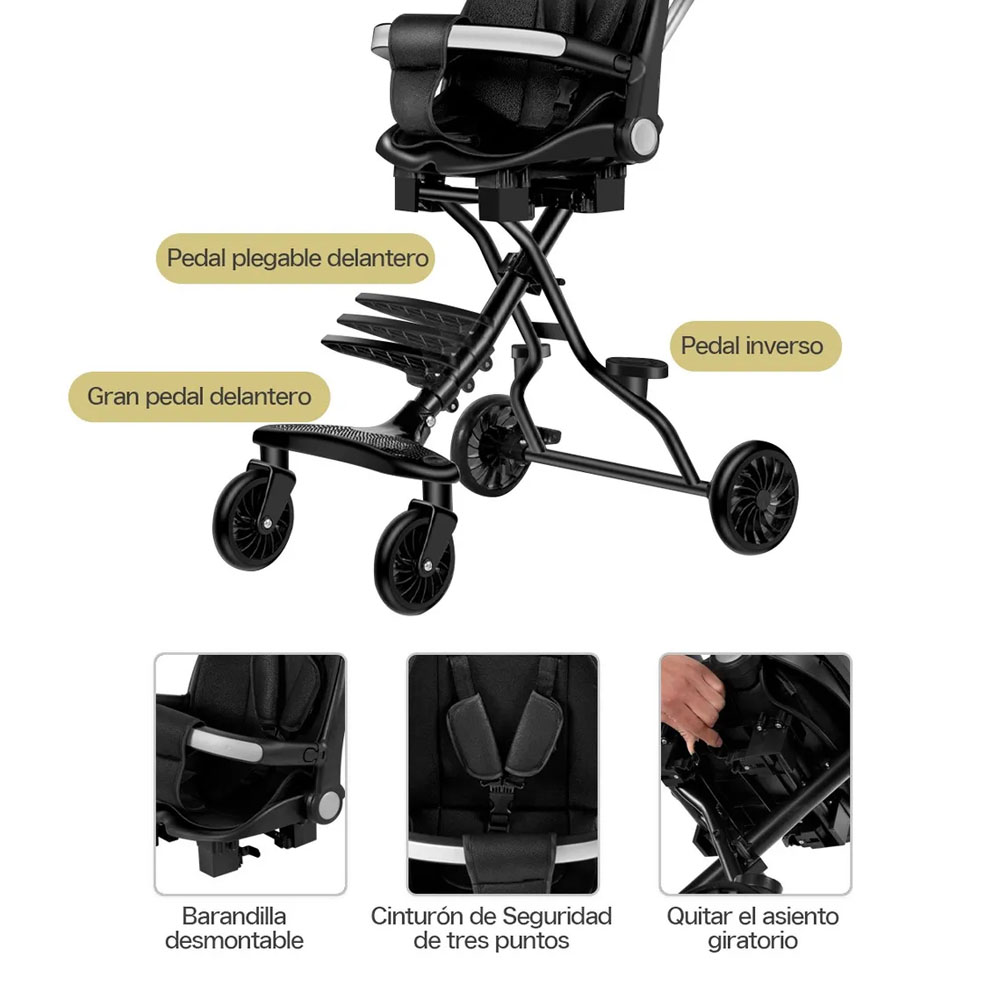 - Reposapiés ajustable: Pedal antideslizante adaptable a diferentes etapas de crecimiento del bebé.