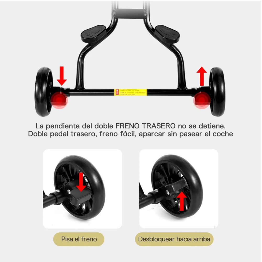 - Doble freno trasero: Sistema de freno seguro que evita deslizamientos en pendientes y facilita el estacionamiento.