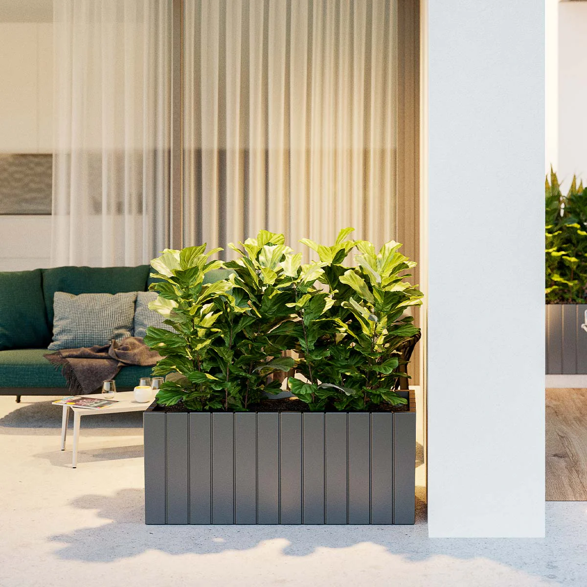 OLIVO LARGE: Macetero rectangular con gran superficie de plantación. Disponible en varios colores y acabados.