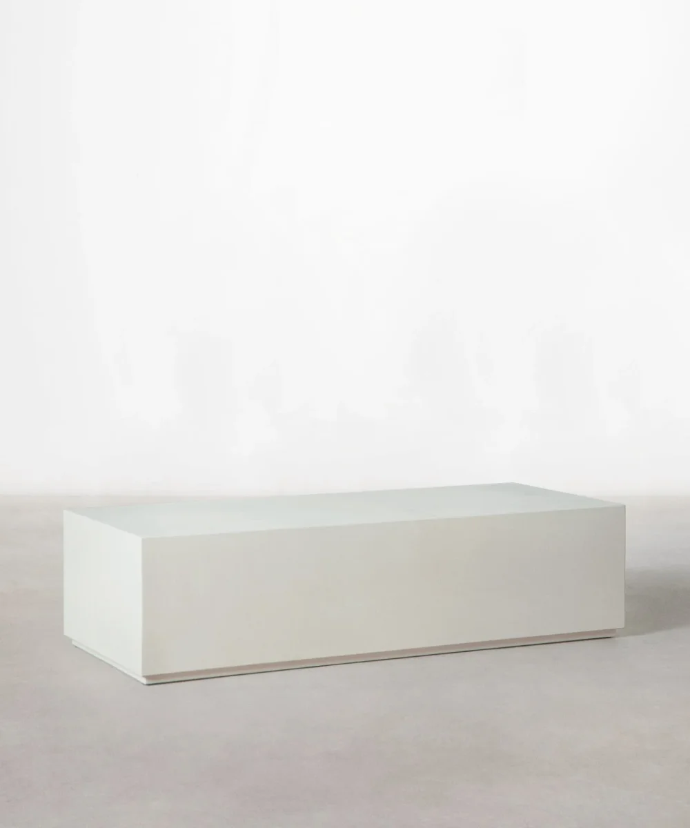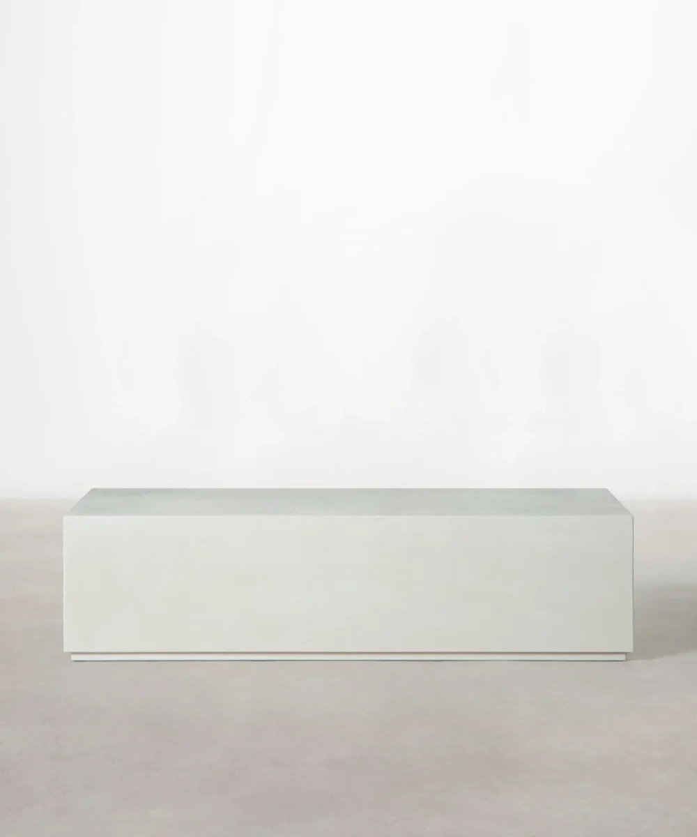 La mesa de centro Fiama destaca por su diseño minimalista y su acabado en microcemento en tono off-white, aportando una estética contemporánea y sofisticada. Sus líneas rectas y su forma baja y alargada la convierten en una mesa de centro moderna ideal para salones que buscan amplitud visual y un estilo depurado.