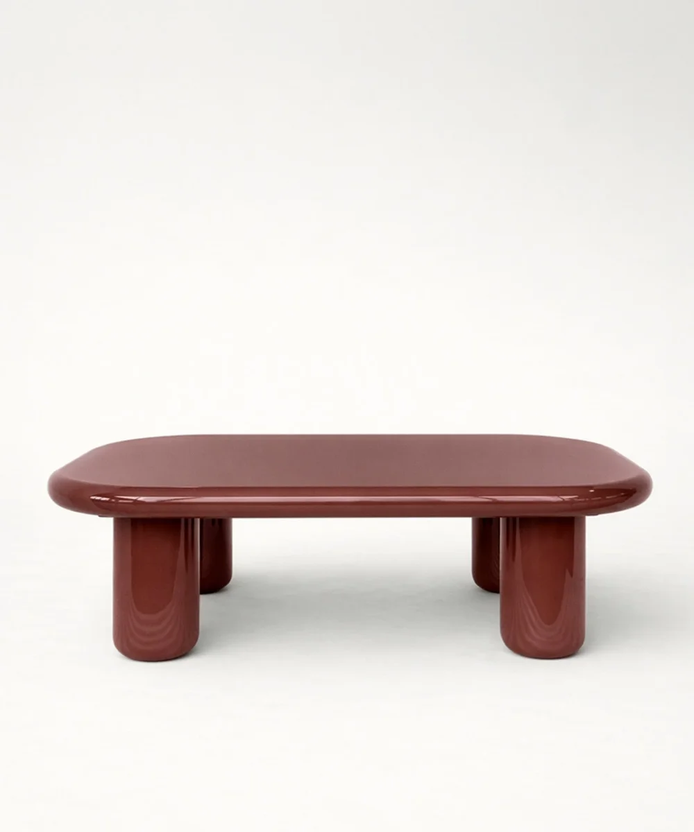 Fabricada en material resistente con acabado brillante, combina estética y funcionalidad en una pieza única. Su amplia superficie permite organizar libros, bandejas o elementos decorativos con comodidad, mientras sus patas cilíndricas aportan estabilidad y refuerzan su diseño escultórico.