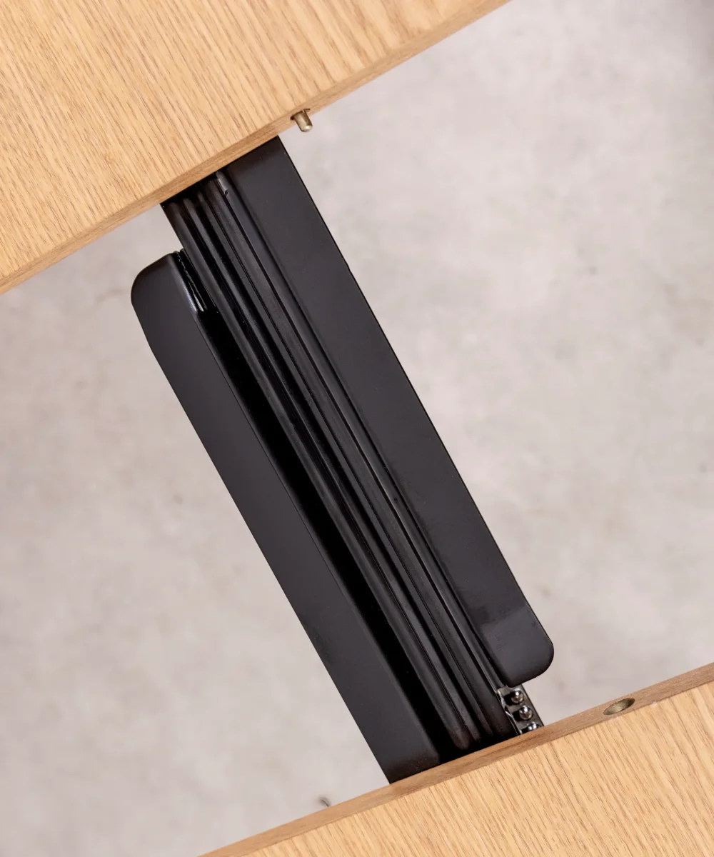 La mesa Karen combina una elegante superficie de madera contrachapada en roble con patas metálicas lacadas, creando un equilibrio entre calidez y modernidad.