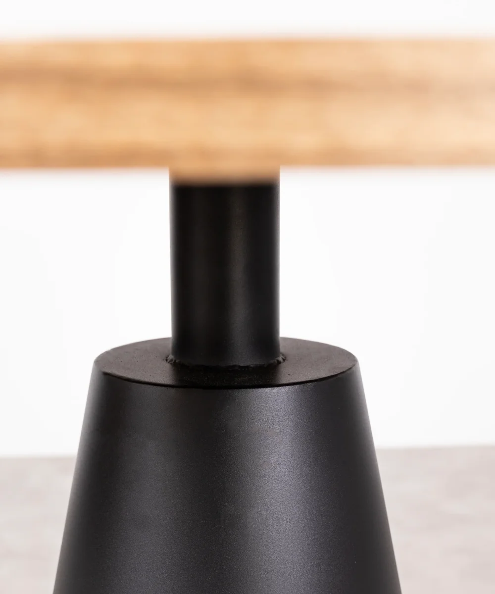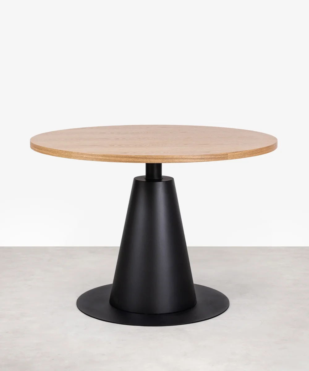 La mesa destaca por su base cónica sólida en acabado negro mate. La superficie redonda en madera contrachapada de roble natural, ofrece un espacio amplio para cenas o reuniones.