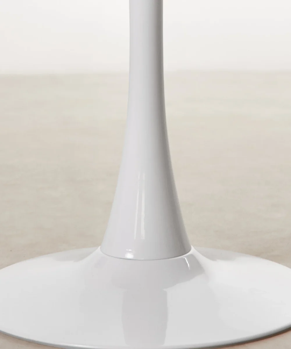 La mesa Tulia redonda es un icono del diseño moderno, reconocible por su base central estilizada en forma de cáliz. Su estética minimalista y fluida elimina las patas tradicionales, aportando ligereza visual y mayor comodidad al sentarse.