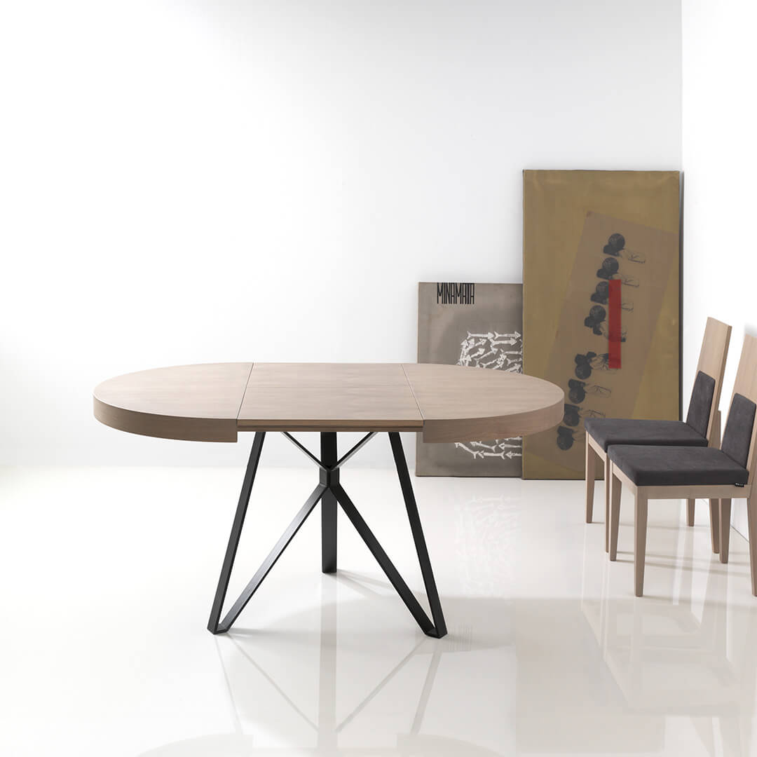 MESA DE COMEDOR Ø110cm EXTENSIBLE ( 55cm).TERMINADA EN CHAPA NATURAL DE ROBLE Y PATA METALICA.