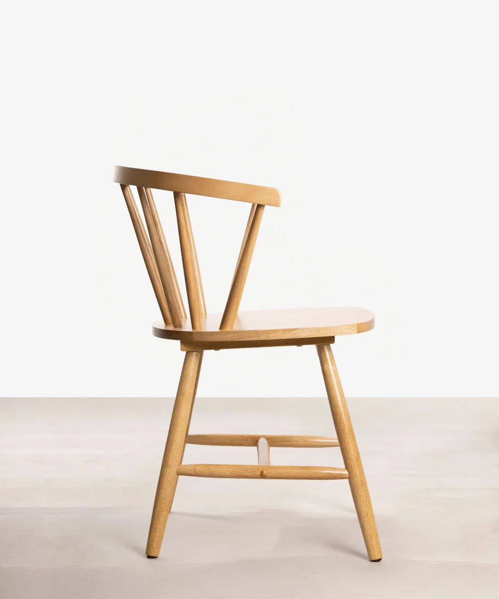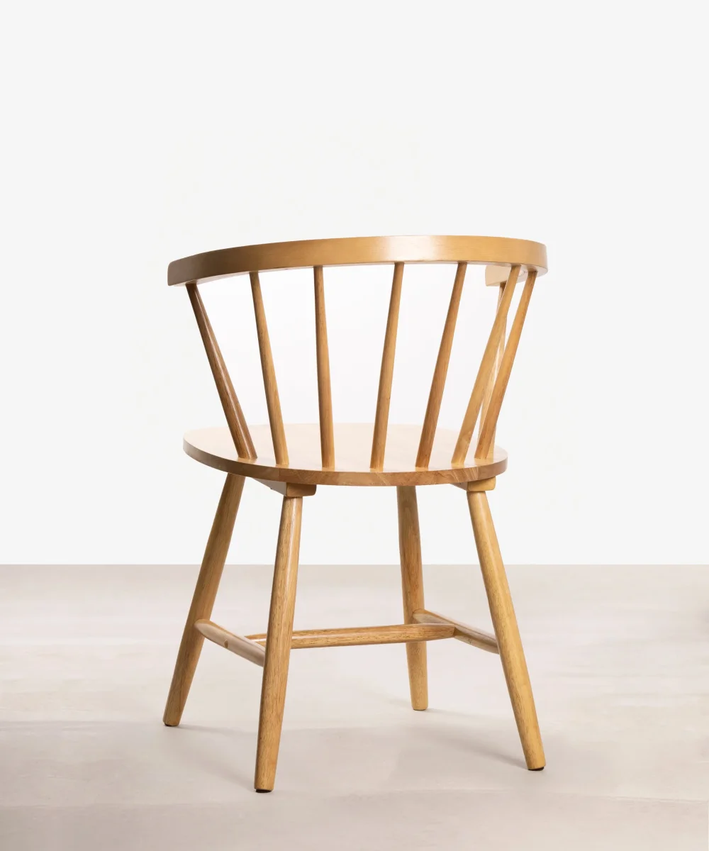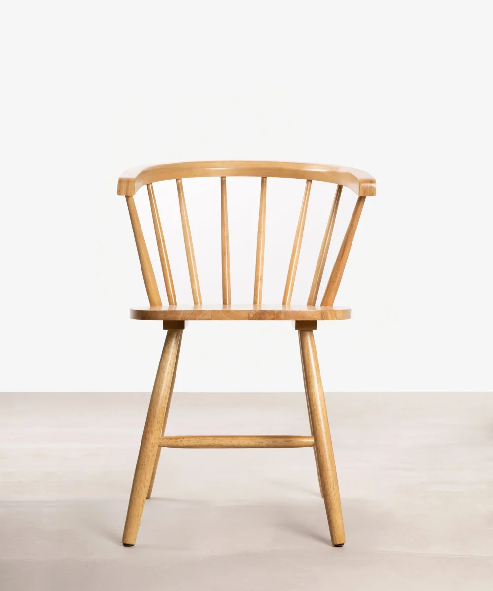 Las Sillas Sena Arms, con su inconfundible diseño retro, se convertirán en las protagonistas indiscutibles de tu comedor. Su respaldo con varillas y sus características patas evocan el estilo nórdico de los años 50. La estructura de madera de hevea maciza es ligera y elegante, con cada varilla finamente tallada artesanalmente, resaltando el auténtico carácter de estas sillas.