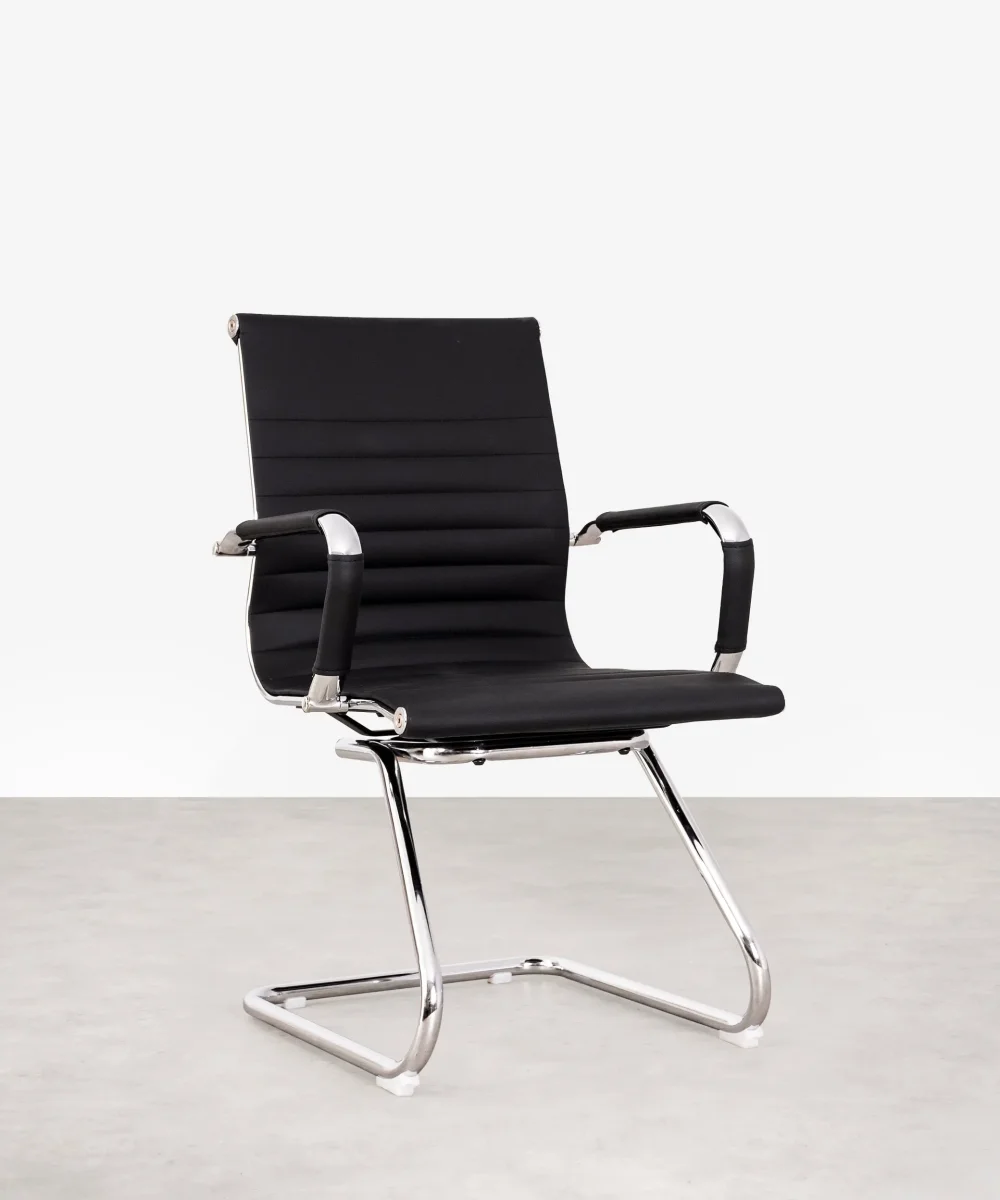 Esta silla está formada por una base de aluminio cromado. Sus patas son fijas y de estilo trineo. El asiento y el respaldo están tapizados en piel sintética resistente y de máxima calidad.
