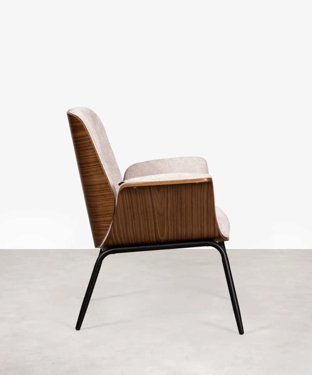 El sillón Vick tiene un diseño retro que destaca por sus líneas limpias y una estructura robusta en madera de nogal y acero negro. El respaldo y los apoyabrazos están suavemente curvados, brindando una experiencia de confort excepcional.